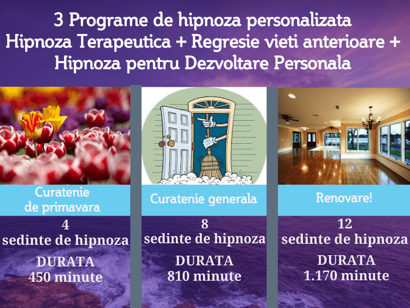 Pachetul 3 „Renovare!” contine o serie de 12 sedinte de hipnoza impartite astfel: 4 sedinte de regresie in vieti anterioare + 4 sedinte de hipnoza terapeutica + 4 sedinte de hipnoza pentru dezvoltare personala.